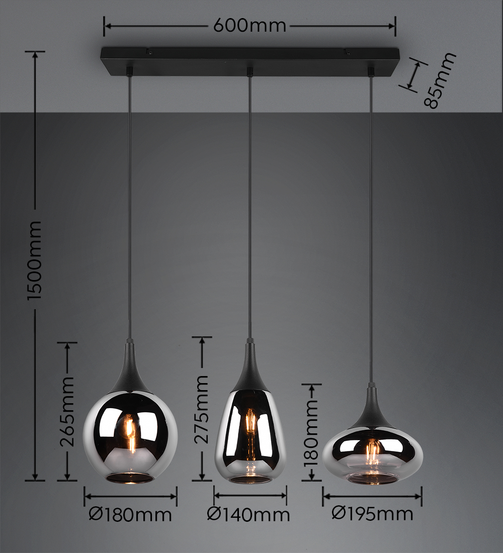 317000332 LUMINA Lustra,melns metāls, dūmakainais stikls, 3xE14 P688mm H1500mm D340mm TRIO