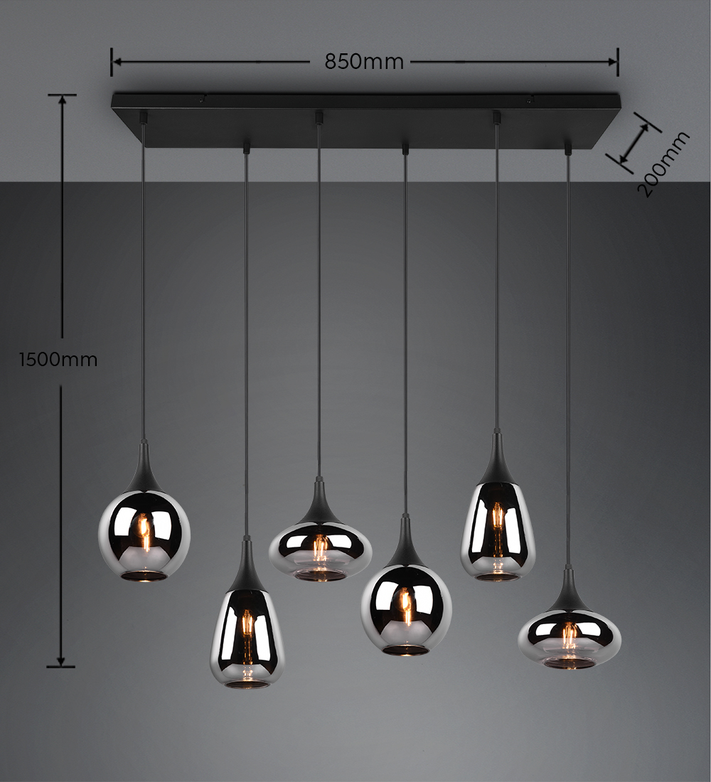 317000632 LUMINA Lustra,melns metāls, dūmakainais stikls, 6xE14 P930mm H1500mm D340mm TRIO